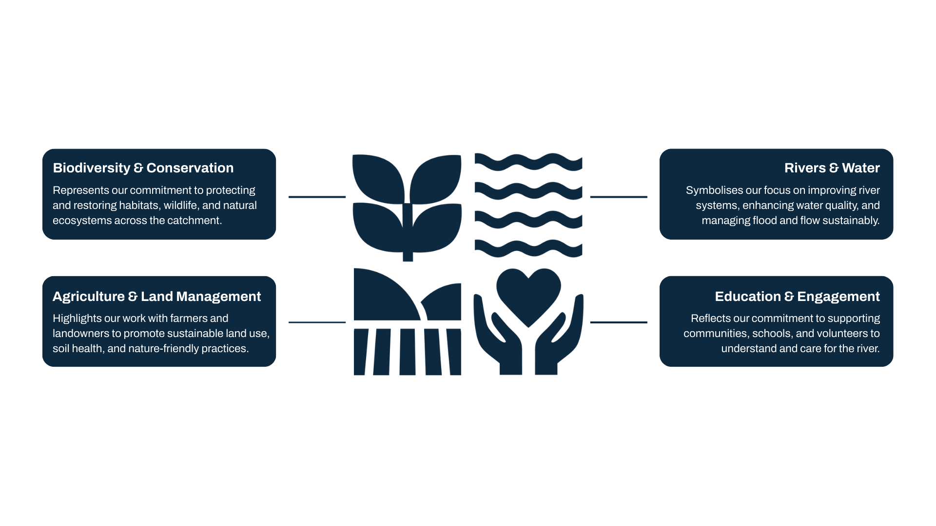 Each segment of our logo tells a story about the work we do. From conserving habitats and managing rivers, to supporting sustainable farming and working with communities, these four pillars illustrate how we bring people, knowledge, and action together to care for the River Wear and its catchment.